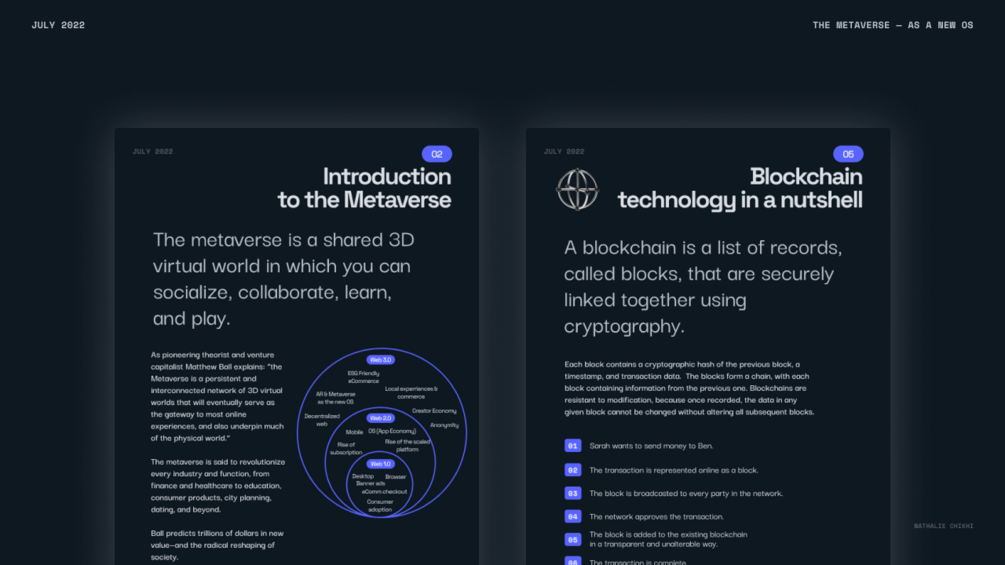 1. Essay 2. Introduction to the Metaverse 3. A visual history of the Tokenization 4. What will be tokenized in the next 10 yrs 5. Blockchain technology in a nutshell 6. Crypto currencies and NFTs 7. NFTs for the creator economy 8. Privacy & user data ownership