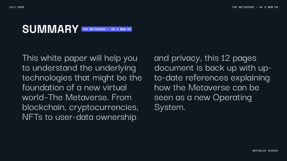 This white paper will help you to understand the underlying technologies that might be the foundation of a new virtual world –The Metaverse. From blockchain, cryptocurrencies, NFTs to user-data ownership and privacy, this 12 pages document is back up with up-to-date references explaining how the Metaverse can be seen as a new Operating System.